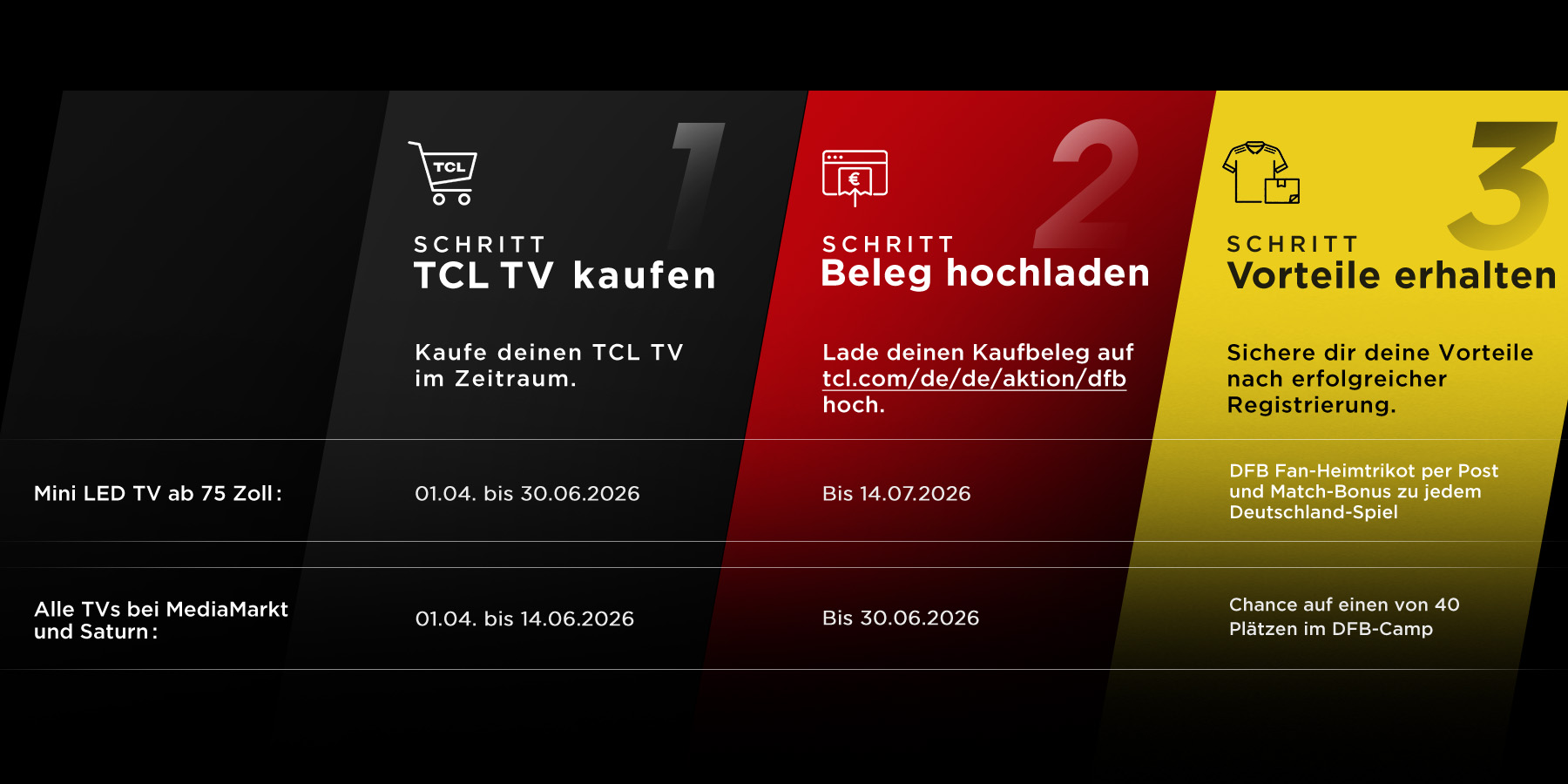 XXL CHANCE: Die Aktion verbindet den Gerätekauf mit einem Gewinnspiel – Käuferinnen oder Käufer eines TCL TVs jeder Größe bei MediaMarkt oder Saturn können an der Verlosung für ein zweitägiges Trainingscamp am DFB-Campus in Frankfurt teilnehmen. Insgesamt stehen 40 Plätze für Kinder mit Begleitperson zur Verfügung, inklusive Unterkunft und Verpflegung. Aktionszeitraum: 01.04. bis 14.06.2026